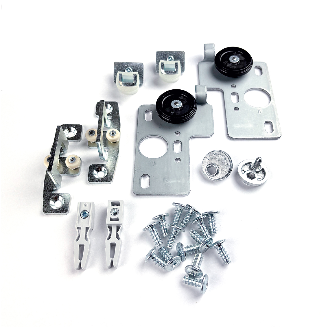 Golvgående skjutdörrsbeslag Iline för trädörrar med en maxvikt på 50 kg. Passande dubbelskena för utanpåliggande montering eller enkelskena för infräsning - se tillbehör. Skena köps separat.