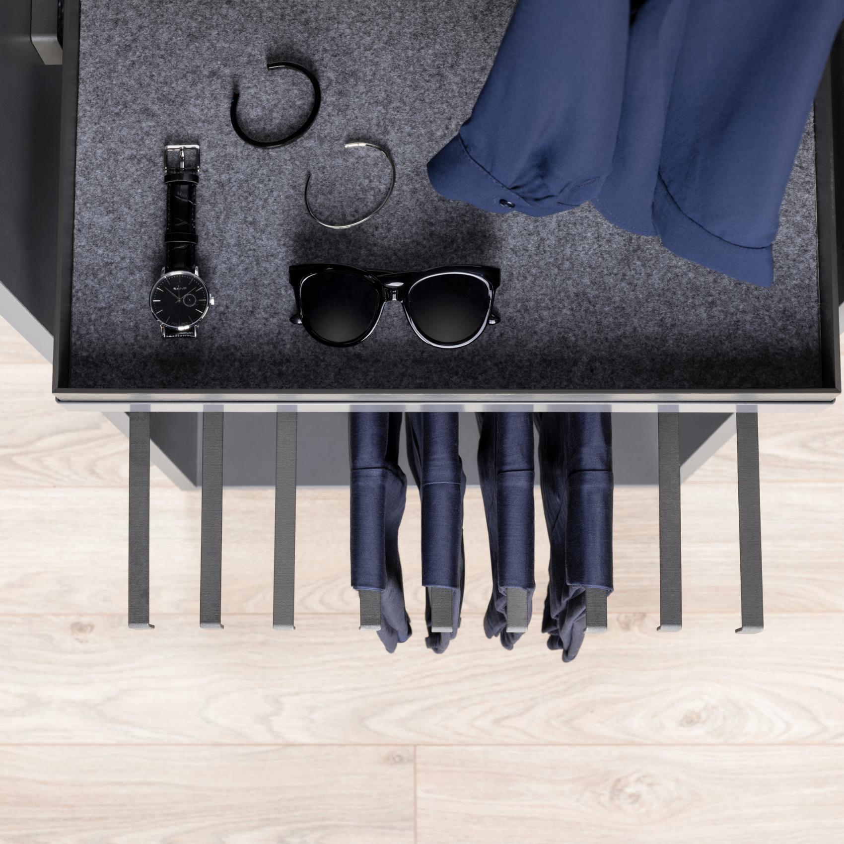 Stilrent byxutdrag med mjukstängning för skåpbredd 500, 600 eller 800. Organisera byxor för snabb överblick och åtkomst.