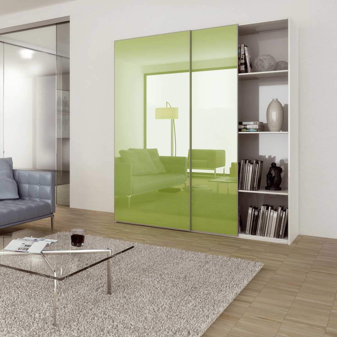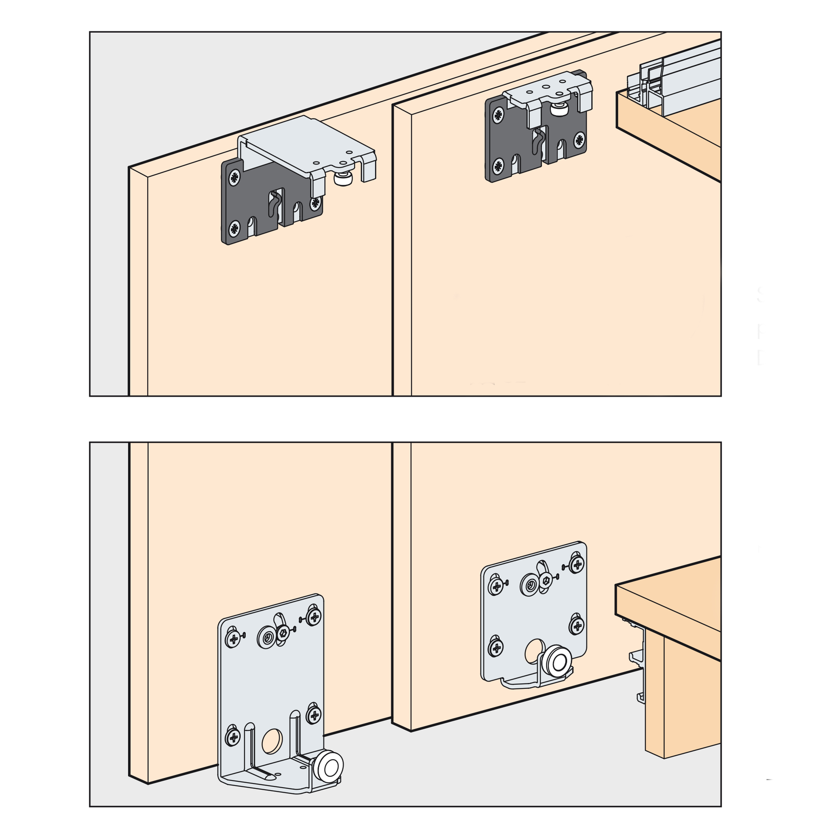 Skjutdörrsbeslag för 2-3 st trädörrar (max 35 kg st) som löper framför skåpet, såkallad forslide. Beslagssatsen levereras utan skenor som beställes separat, se tillbehör.