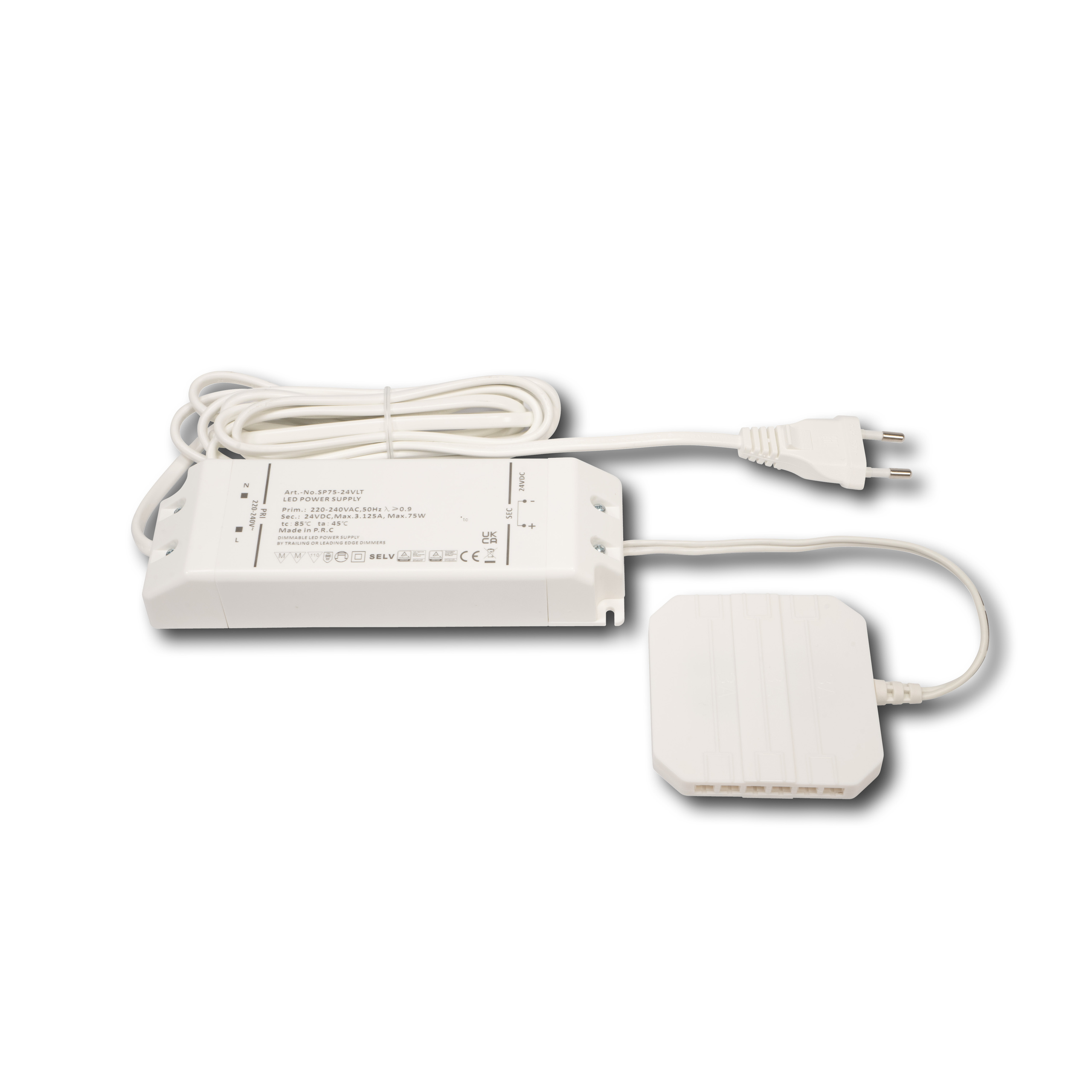24V-drivdon passande belysning från L&S. Drivdonet är anpassat för dimning på primärsidan, t.ex. en vriddimmer infälld i kopplingsdosa i väggen. Drivdonet fungerar med de flesta framkant- eller bakkantsstyrda dimmers avsedda för elektroniska transformatorer.