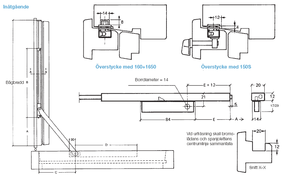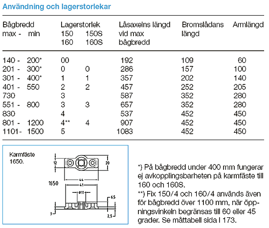 OBS! Vänster används för överliggande montering oavsett vänster- eller högerhängt. Höger används för underliggande montering. Bild visar vänster. Fix 150 2 broms för bågbredd 401-550 mm. Fix 150 3 broms för bågbredd 551-800 mm. Fix 150 4 broms för bågbredd 801-1100 mm. Slutbleck 62R används för spanjolett 865/865F, och 867/867F.
