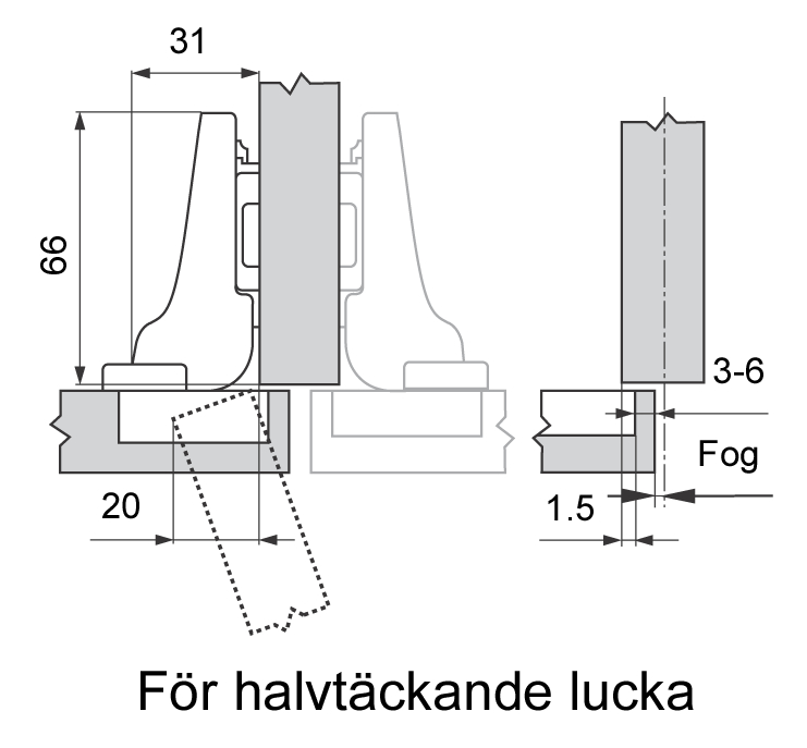 Odämpad. Med enkel djupjustering genom excenter. Vid INSERTA, verktygslös montering av grytan. Gångjärnet används tillsammans med lämplig monteringsplatta som beställs separat.