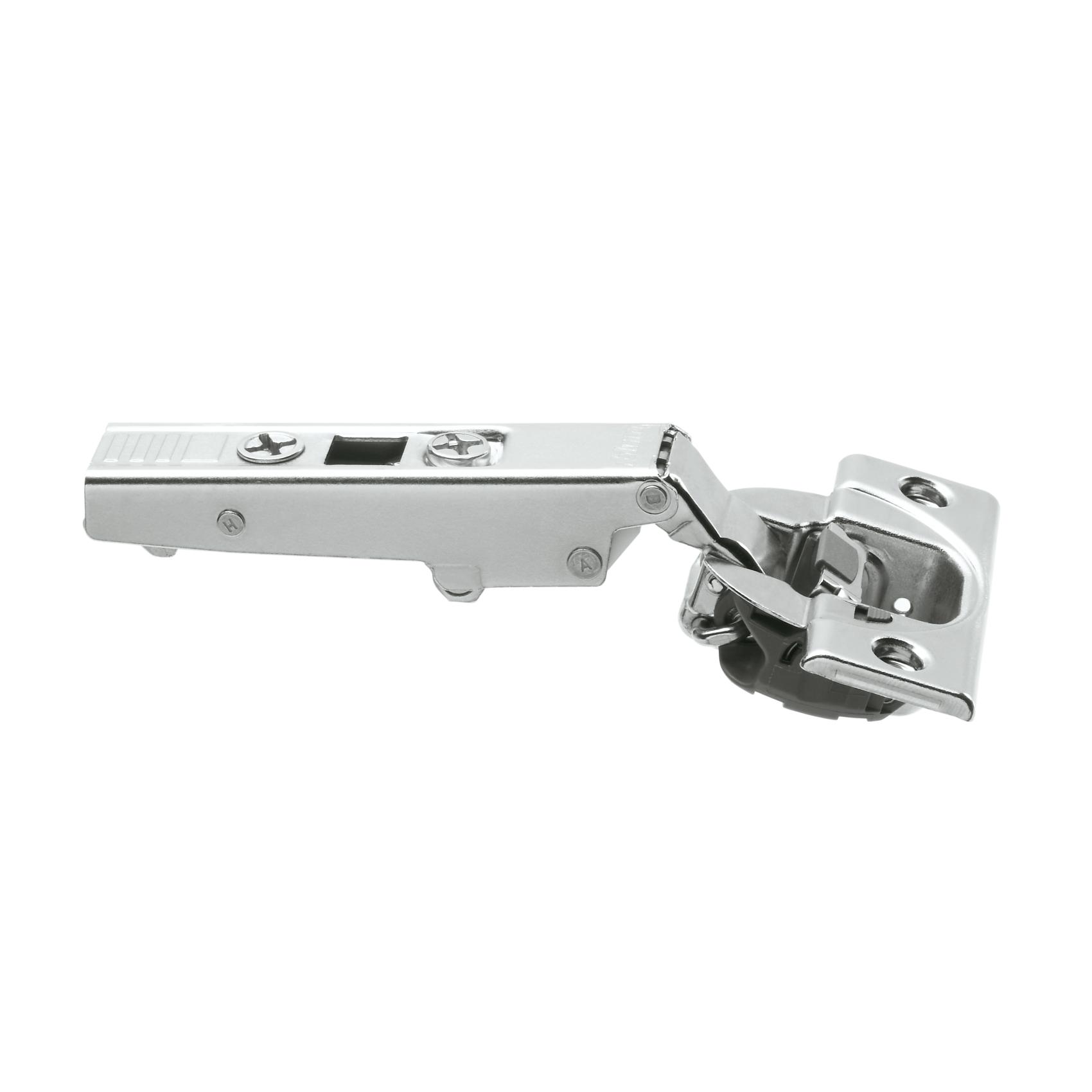 Gångjärn i förnicklad metall för heltäckande lucka med öppningsvinkel 110°. Finns med eller utan dämpning, så kallad BLUMOTION.