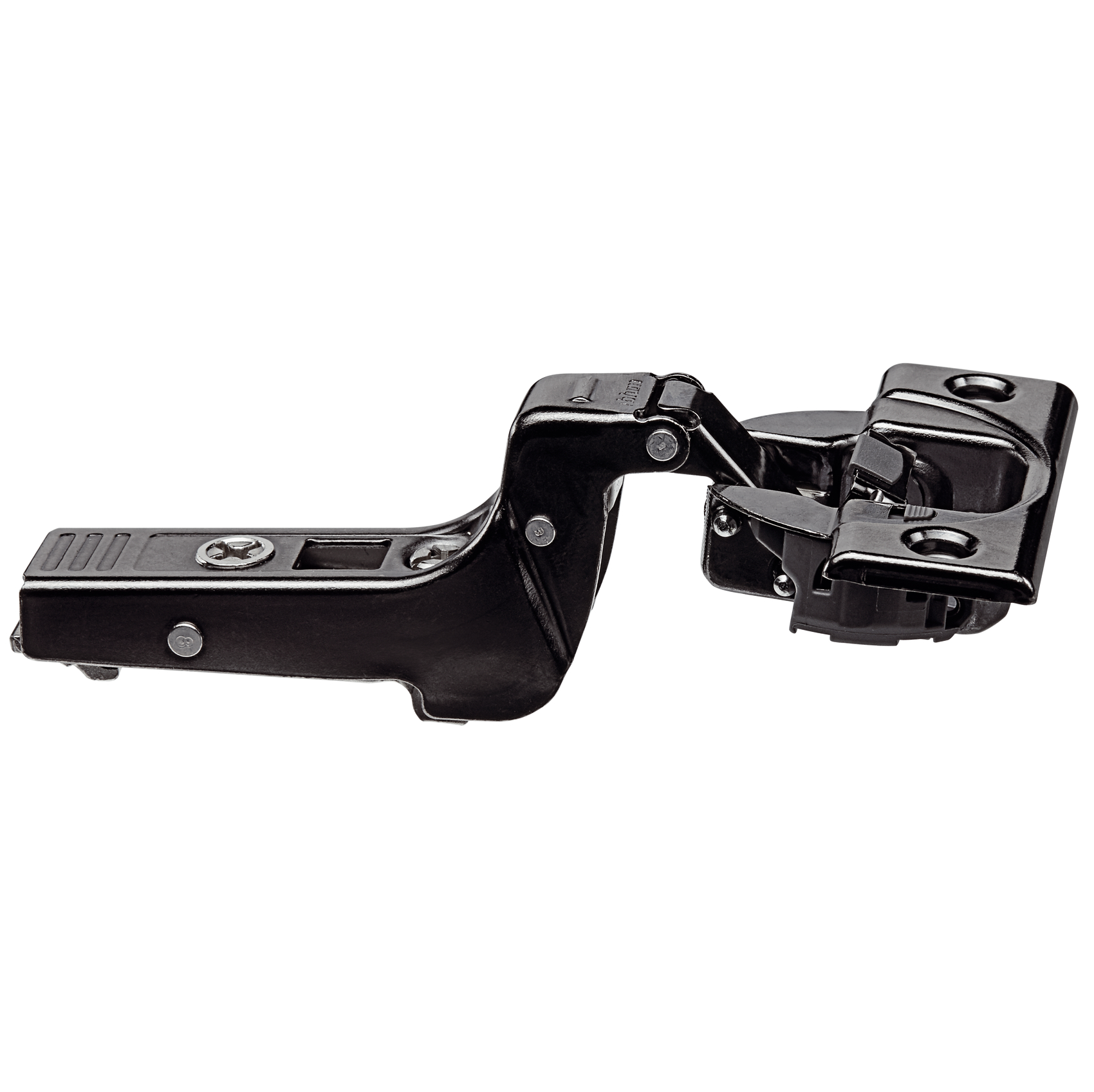 Gångjärn i förnicklad metall med onyxsvart yta för profildörr med innanförliggande lucka med öppningsvinkel 95°.