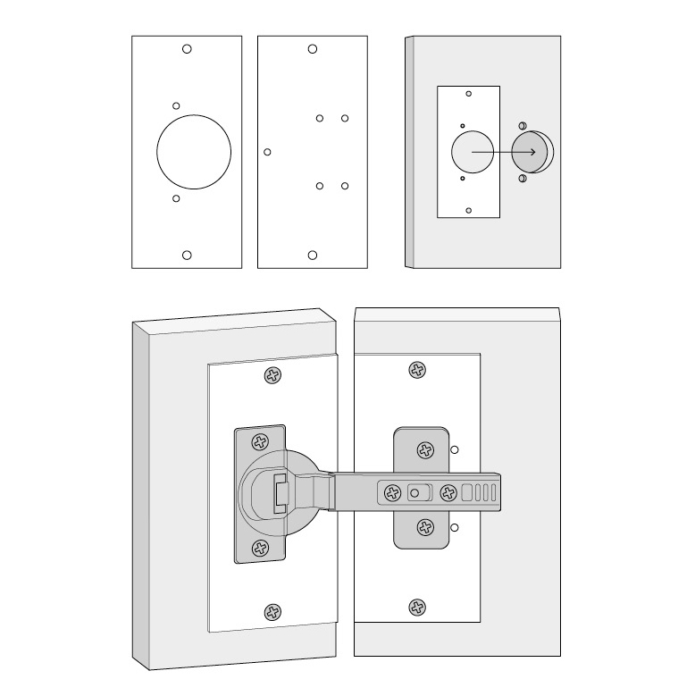 Förstärkning som monteras under gångjärn med 35mm gryta för att stadga upp gamla eller ostadiga skåpsdörrar.