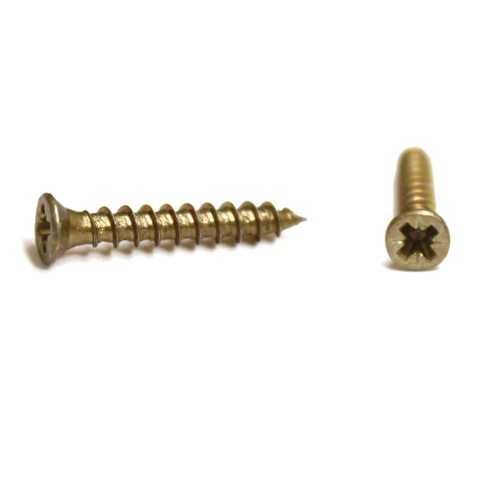 Träskruv i gulkromaterat stål (GKR), med försänkt huvud och krysspår.