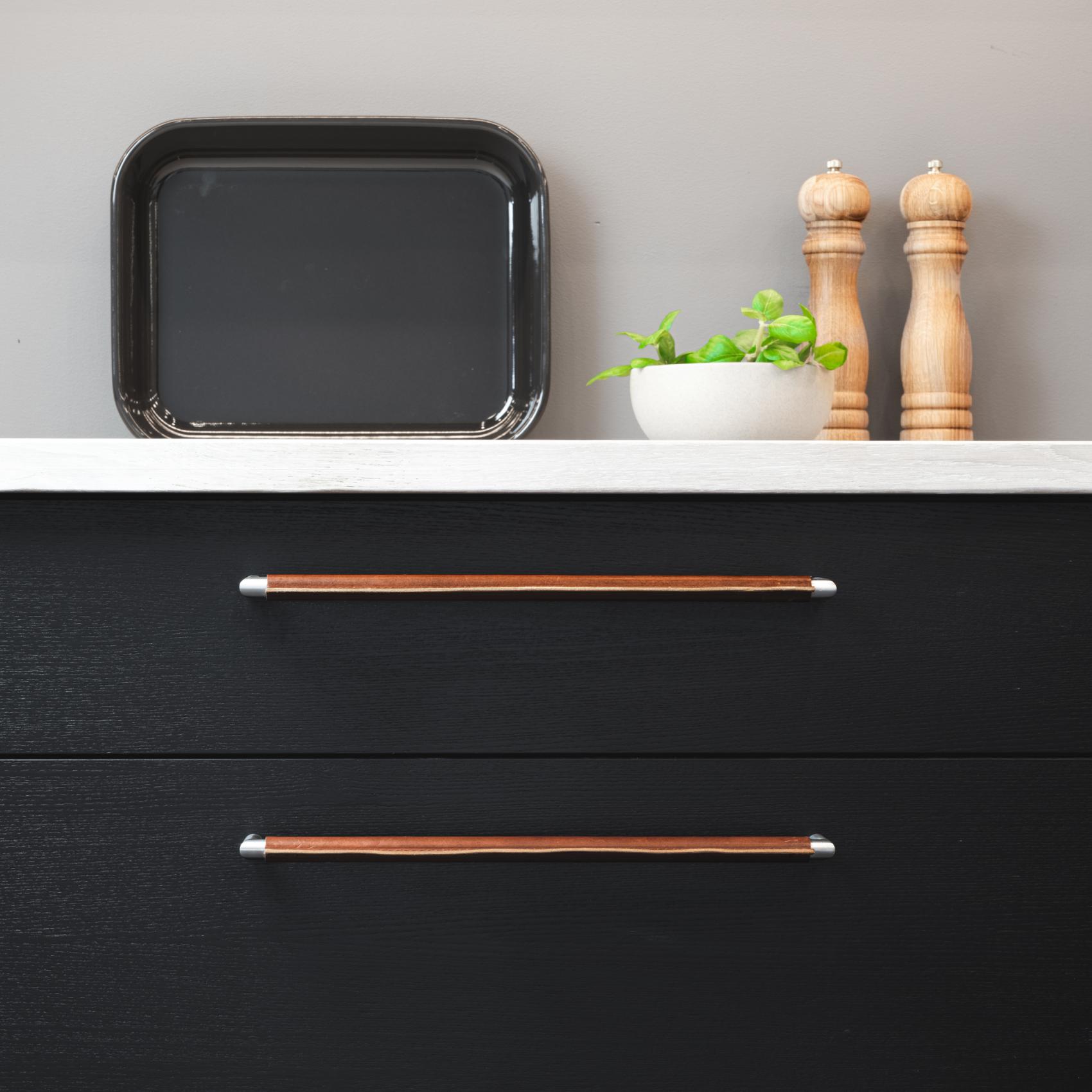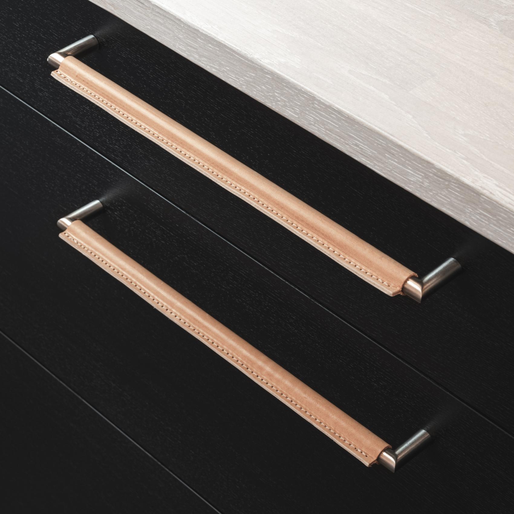 Grundmaterialet i Monopoli är rostfritt stål och därefter finns handtaget med tre olika läder; brun, svart och natur. Variationen gör att det alltid finns en modell som matchar luckan/skåpet som handtaget ska smycka. Monopoli tillverkas i en bred variation av längder, från CC 96 mm upp till CC 480 mm och allt där emellan. Det är därför vi menar att detta är ett handtag som passar alla miljöer. Från tvättstugan, köket, badrummet och till de större garderoberna. Oavsett färg har lädret en karaktäristisk design med den dekorativa sömnaden som förbinder lädret.