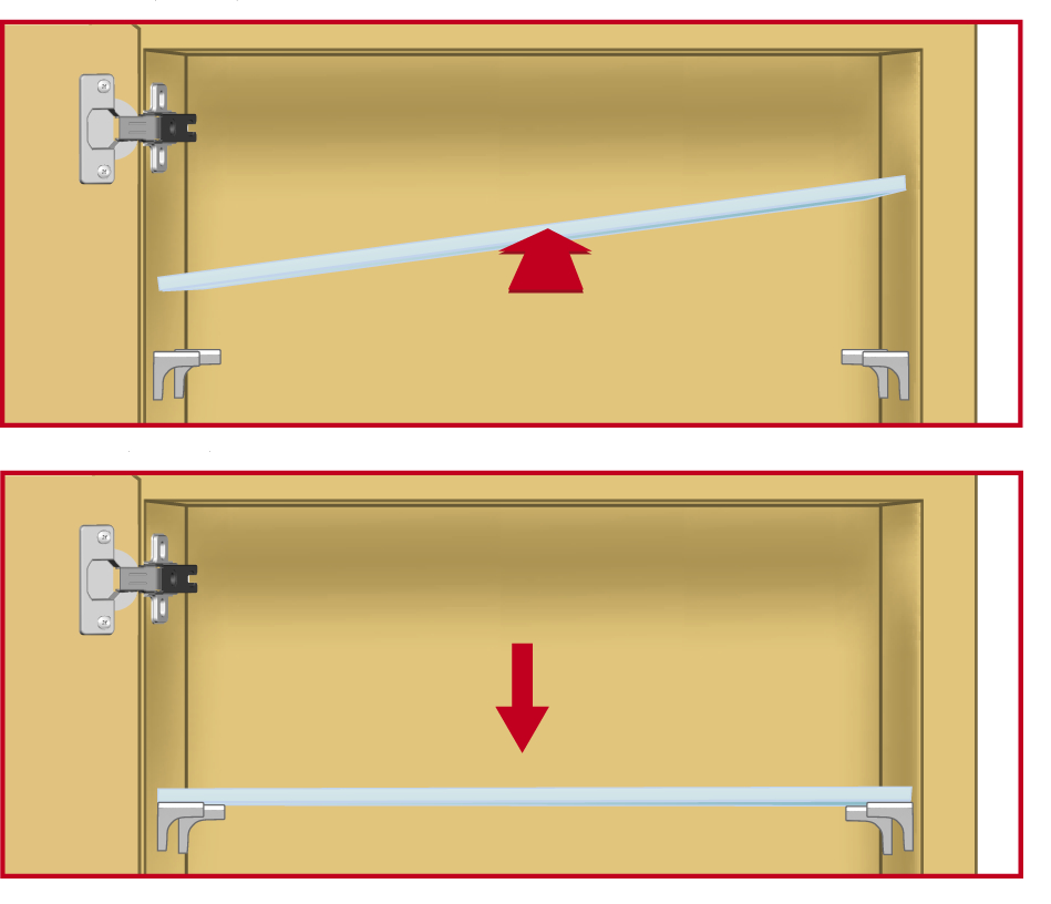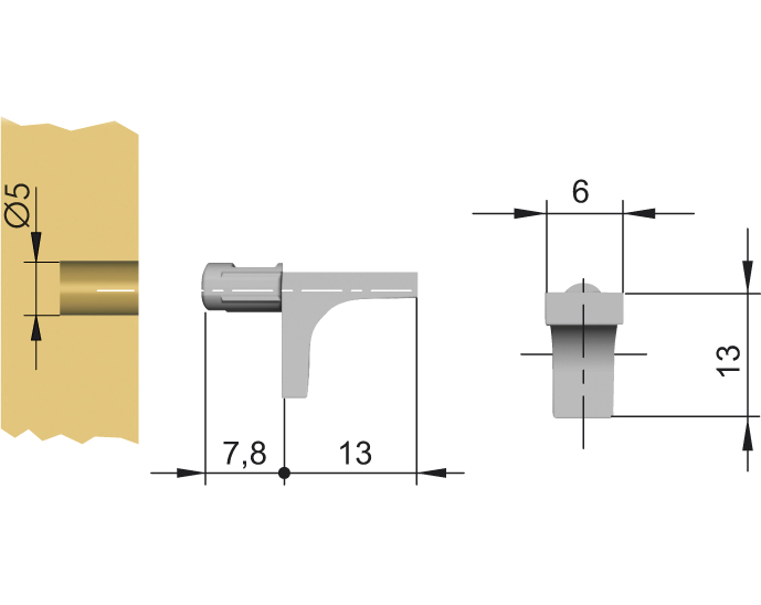 Tappdiameter 5 mm och tapplängd 7,8 mm. Hyllbäraren finns för både trä- och glashyllor, se anmärkning nedan.