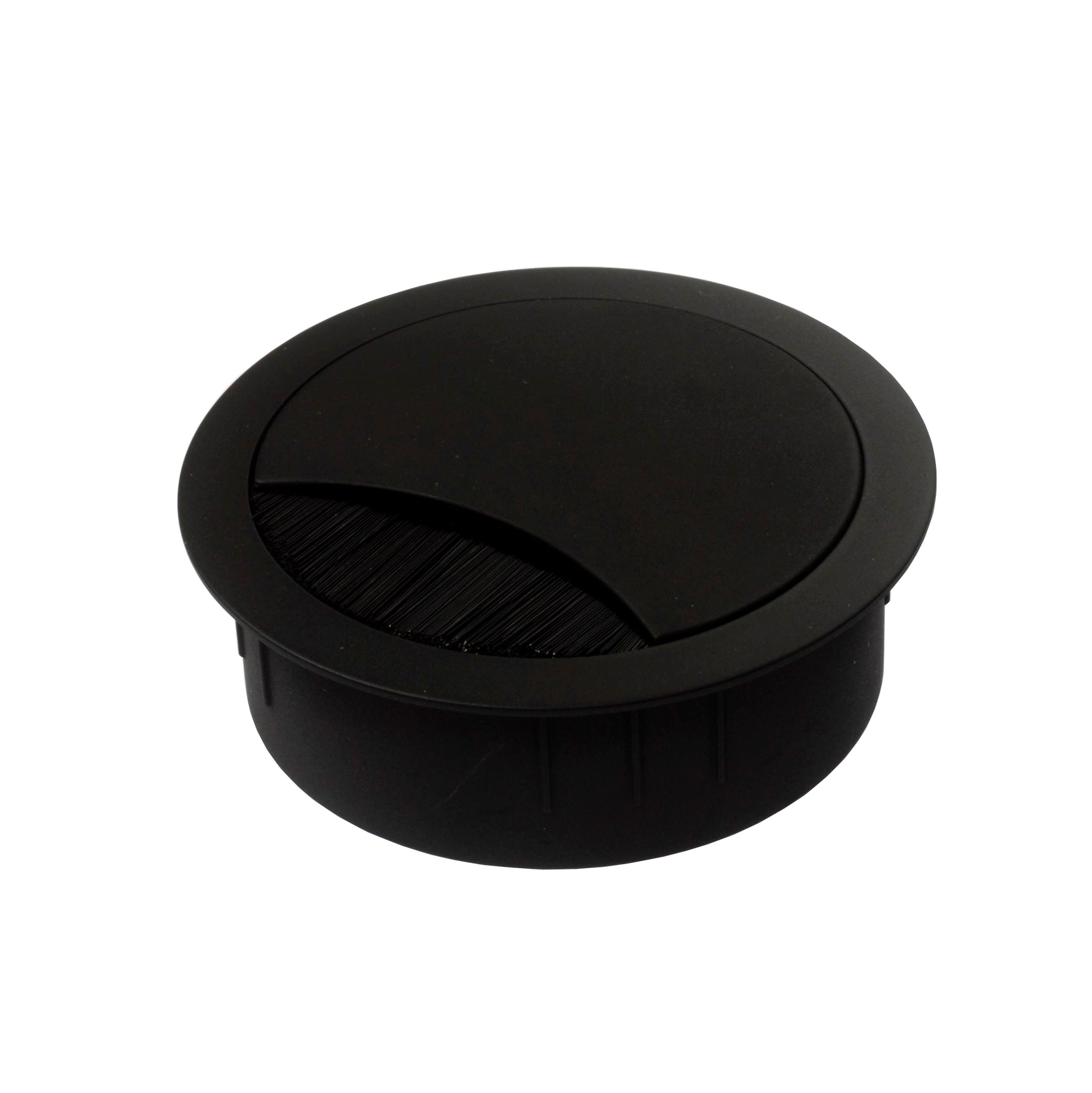 Tvådelad kabelgenomföring i svart med svart penselborst. Inborrningsmått 60 eller 80 mm.