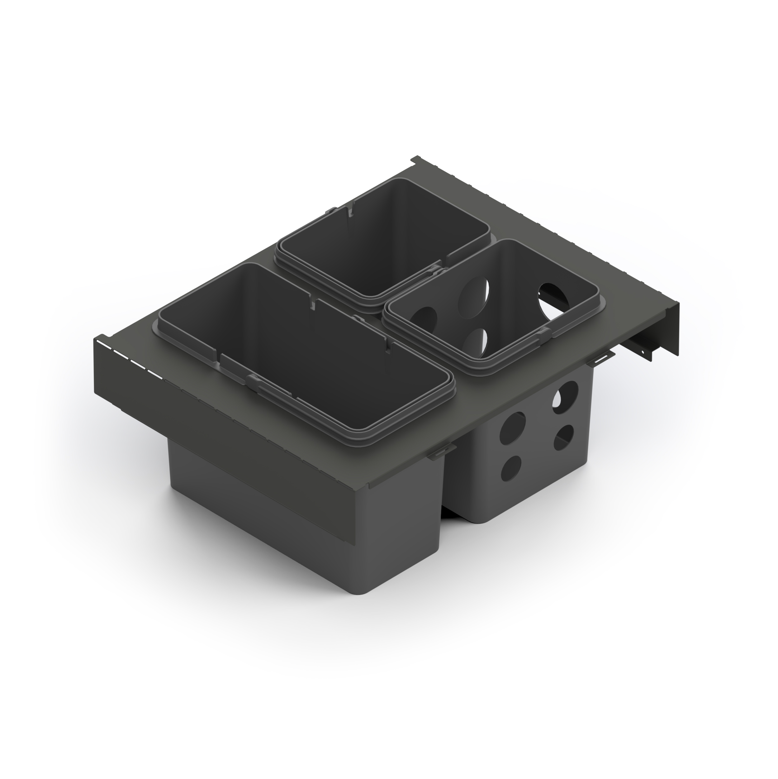 Källsortering Toledo består av sex varianter, utformade för att montera i låda. Toledo monteras på lådsida och finns för 80, 60 och 40 cm breda lådor. Designen på Toledo gör att den passar alla typer av lådsidor på marknaden, rak som svängda. Toledo finns i två olika djup, vilket gör att den både passar grundare lådor med djup på 35 cm för tex diskbänkskåp samt lådor med djup från 45 cm. Tillverkade i Sverige; ram i plåt och hinkar i återvunnen PP-plast.