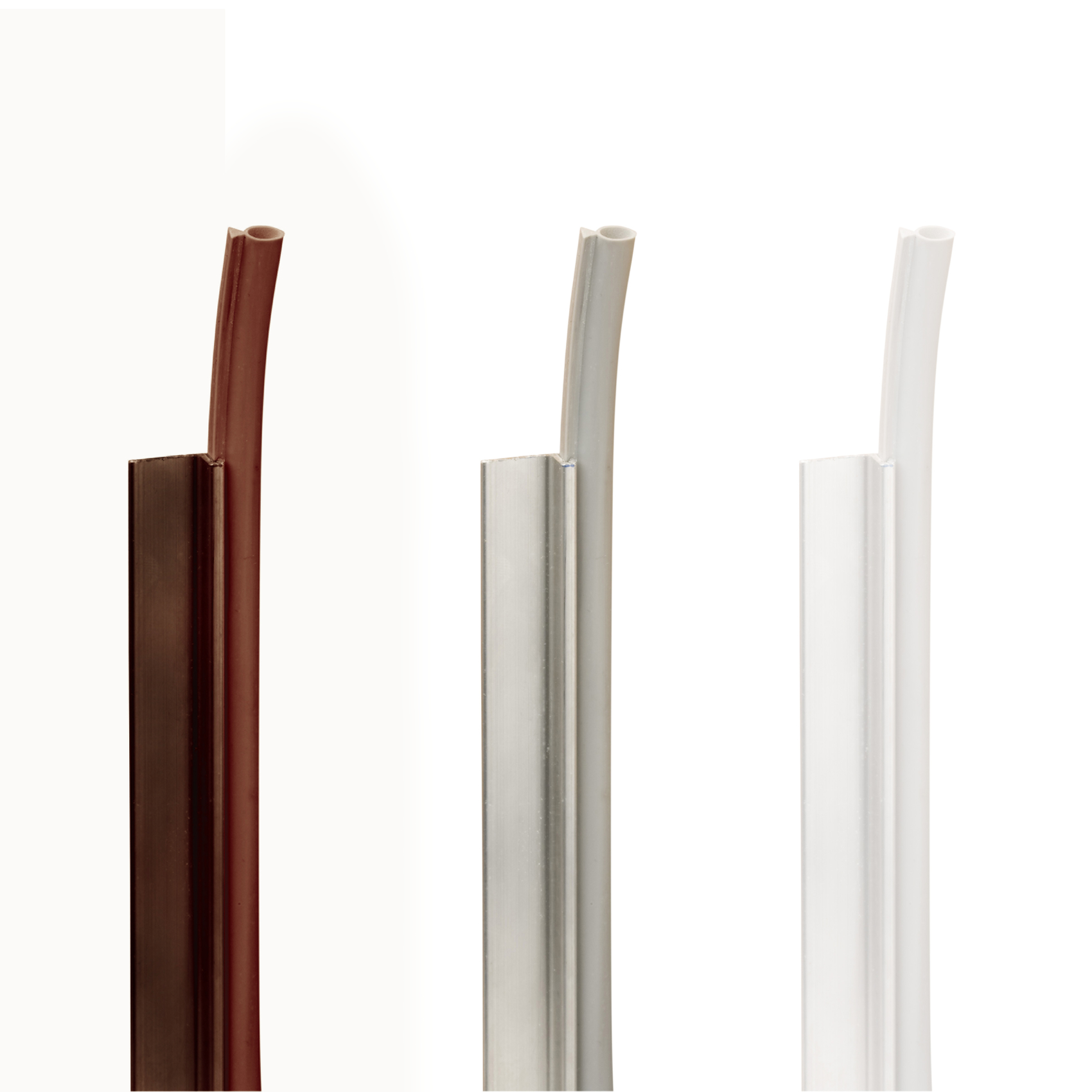 Karmtätlist i aluminium med skruv, skena med tätningslist. Finns i brunt, vitt eller grått.