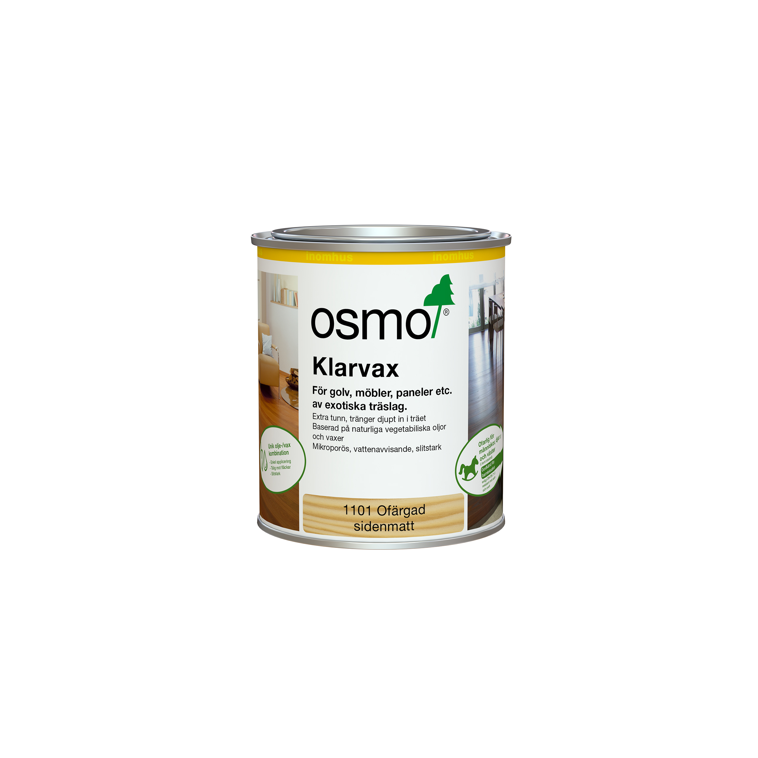 Specifikation Appliceras med Pensel/roller Färg Ofärgad Förpackningsstorlek 0.75 L Glans Sidenmatt Torktid (h) 12-24 Täckning/Förbrukning (m²/liter) 16-24 Varumärke Osmo -