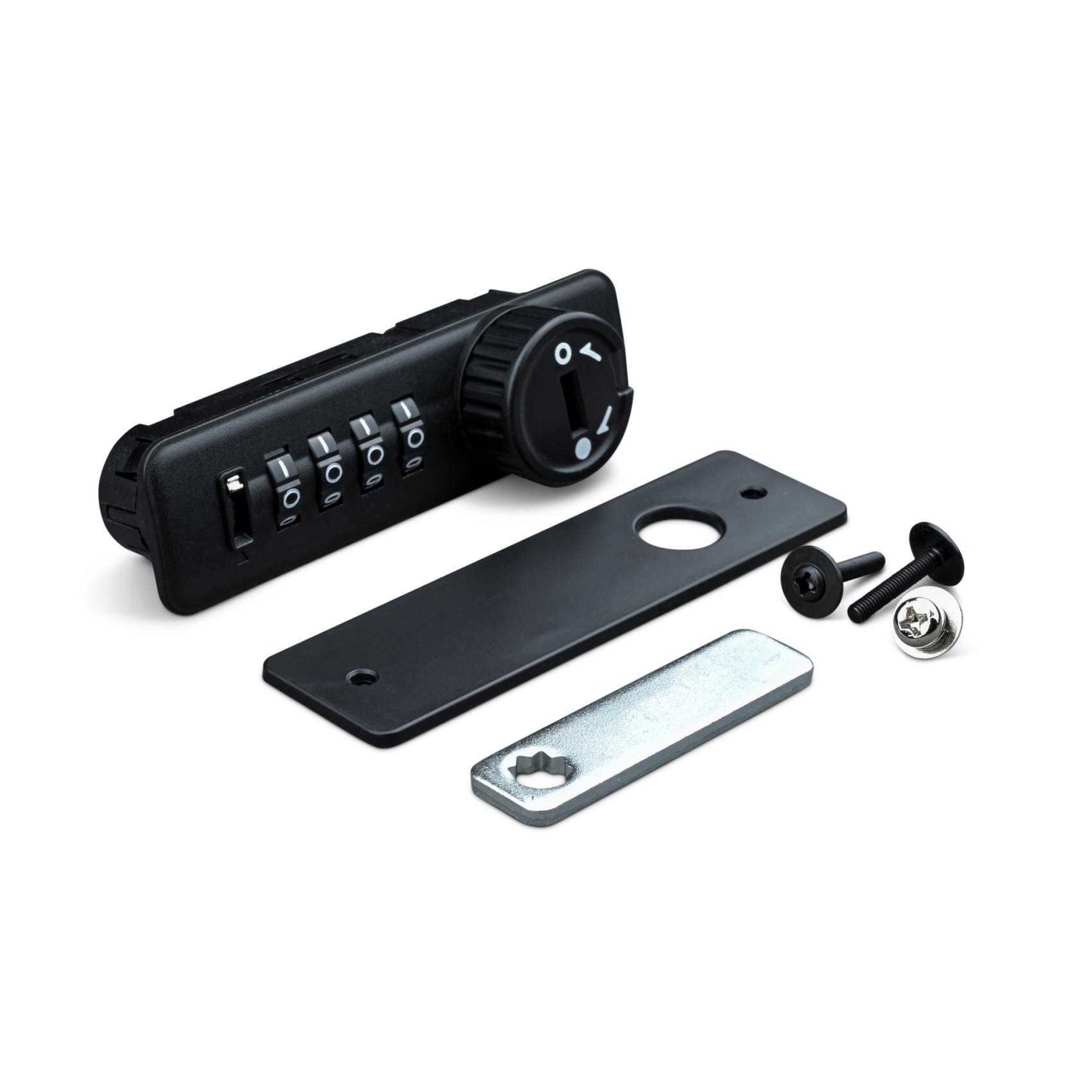 I svart plast med cylinder och låsregel i stål. Levereras med svart bakstycke inklusive svarta skruvar och låshake. Fixed code: En förutbestämd kod gäller vid varje låsning. Public: En ny kod väljs av användaren vid låstillfället.