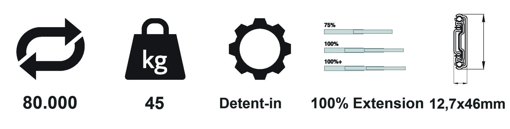 Lämpliga applikationer är möbler, kontorsmöbler, skåp, garderober, kök med mera. Skenan är utrustad med spärr. Kulskenorna är tillgängliga i längder mellan 250 och 700 mm. Testade för 80 000 cykler.