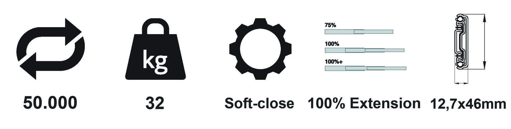 Sidomonterad kulskena med fullutdrag och softclose, bärkapacitet upp till 32 kg.