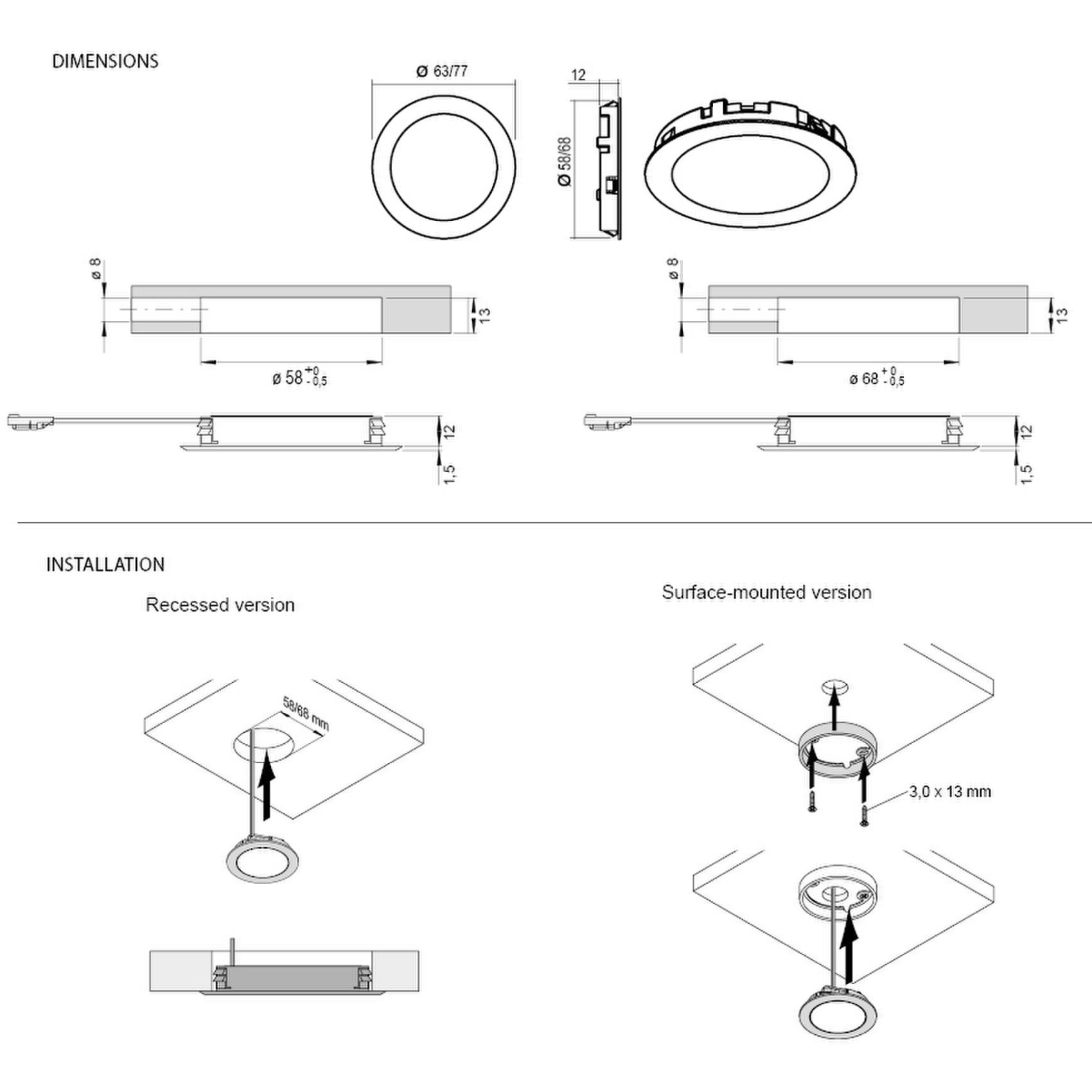 För kallvitt ljus krävs adapter art.nr 310077. Runda distansringar i höjden 12 mm finns att köpa som tillbehör.