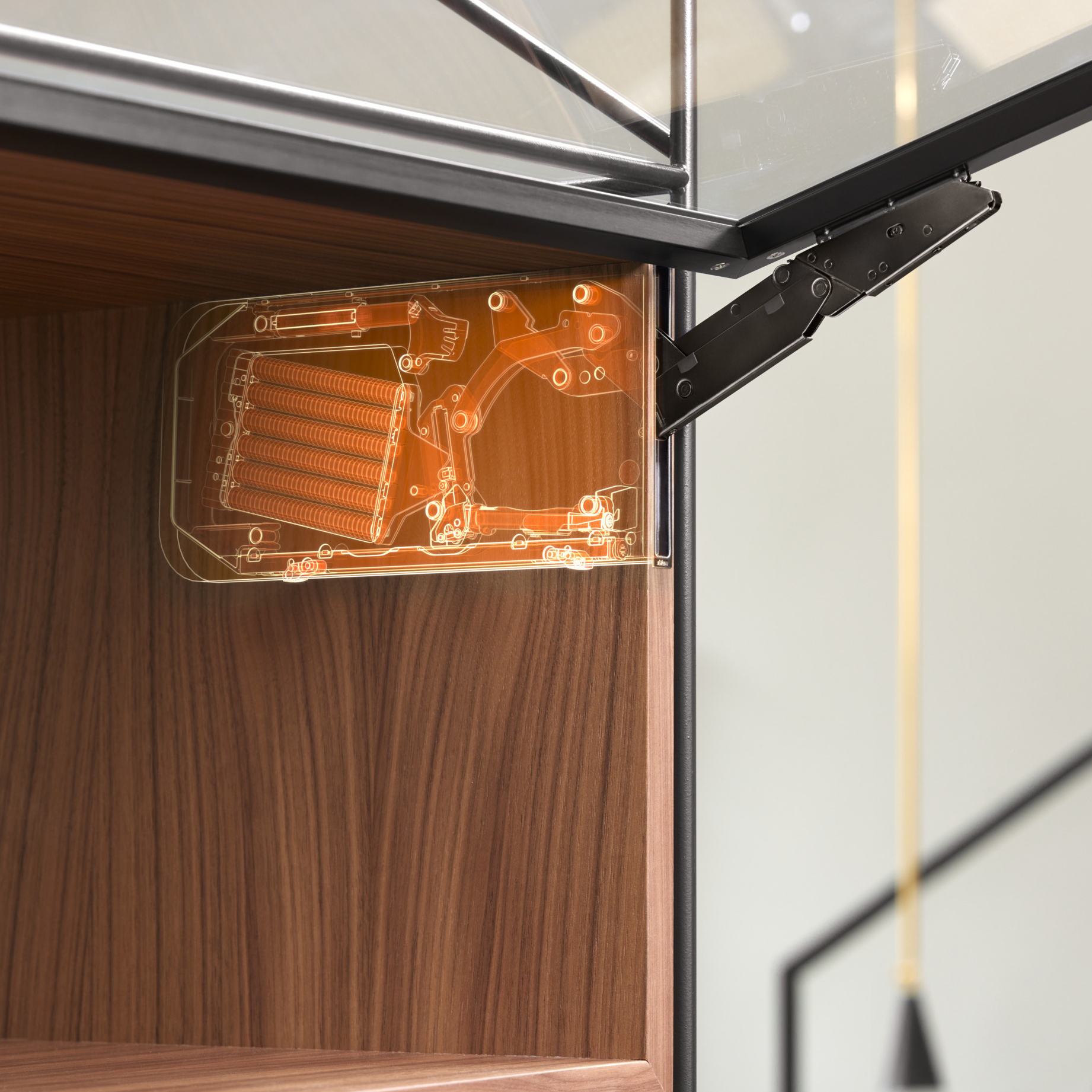 Lyftmekanismen i AVENTOS HKI är integrerad i skåpsidan. Hjärtat i det integrerade klaffbeslaget för överhängda luckor är det robusta fjäderpaketet. Välj mellan TIP-On eller med BLUMOTION