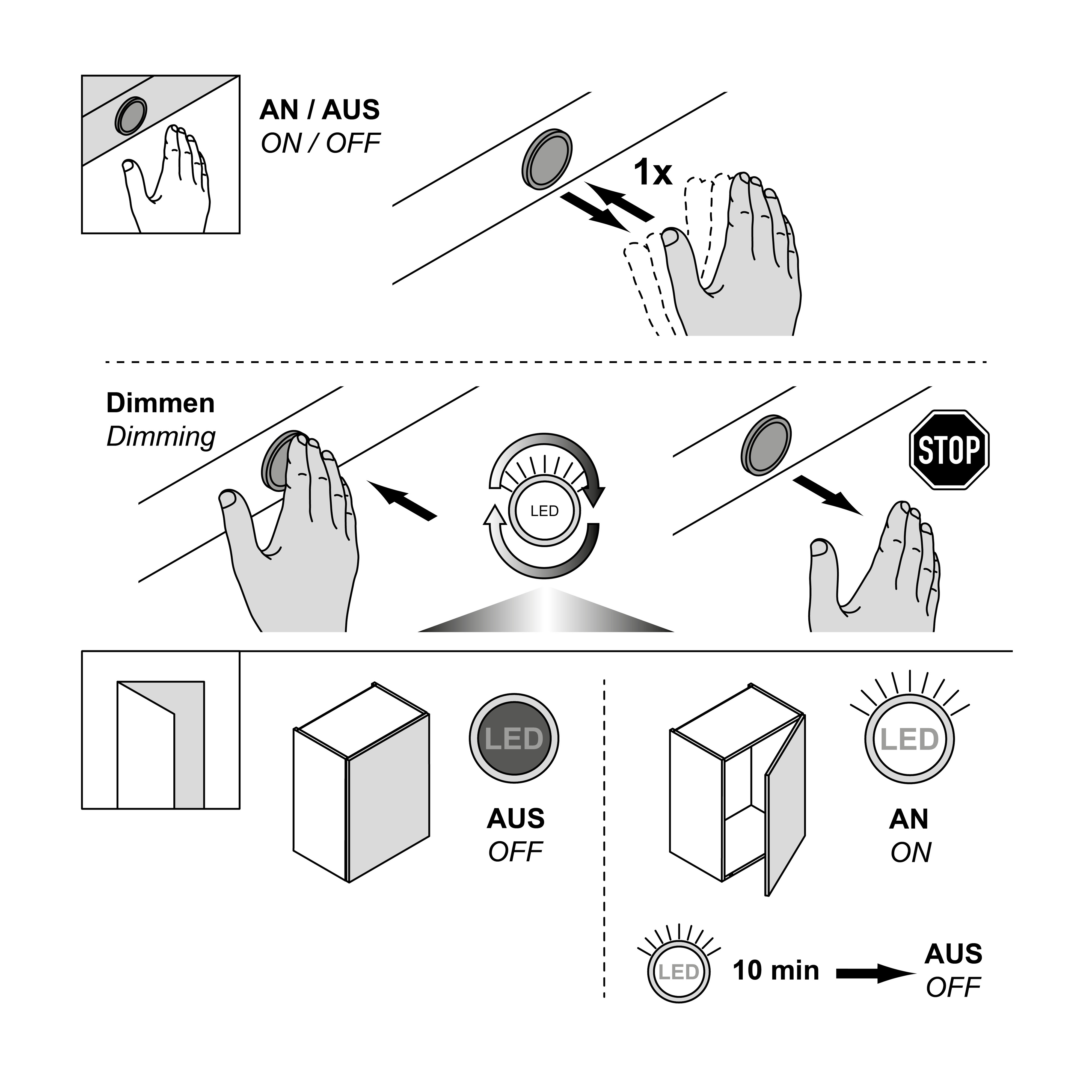 I dörrkontaktsläge släcks belysningen automatiskt efter en viss tid, medan det kontaktlösa läget ger bekväm styrning utan behov av mekaniska strömbrytare. Den lilla sensorn är diskret att installera och passar perfekt för möbler, skåp och andra inredningslösningar där du vill ha smidig och modern ljusstyrning.