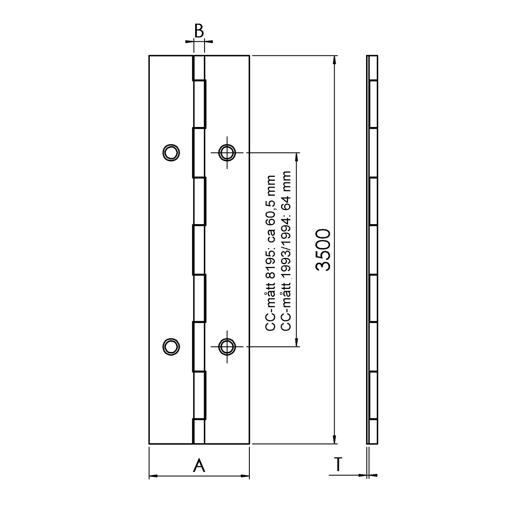 Pianogångjärn 8195/8194 med en standardlängd på 3500 mm. Finns i förnicklat mässing (MN) med mässingsprint och polerat mässing (MP) med mässingsprint.