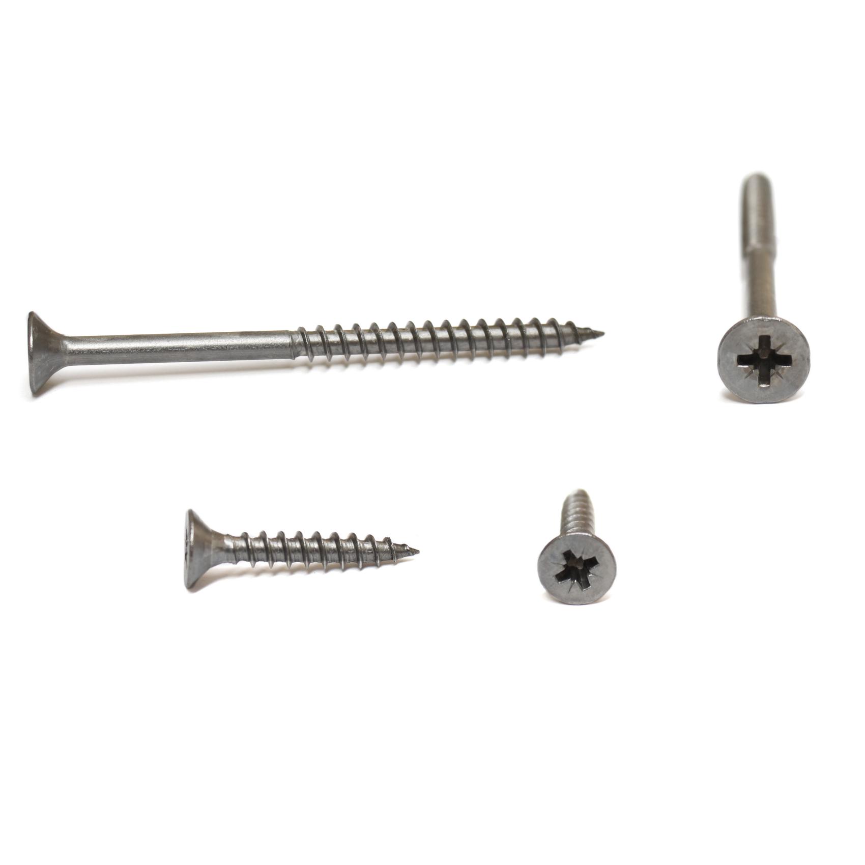 Träskruv i rostfritt stål (RF) med försänkt huvud och krysspår. Finns som del- eller helgängad.
