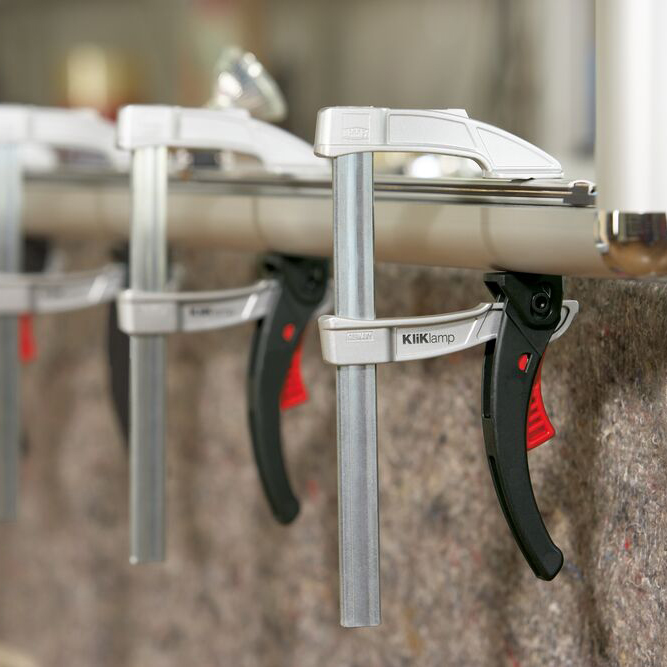 Den fasta bygeln med korsprisma håller säkert fast även runda, spetsiga eller kantiga delar. Detta gör KliKlamp så mångsidig.Ergonomisk spännarm