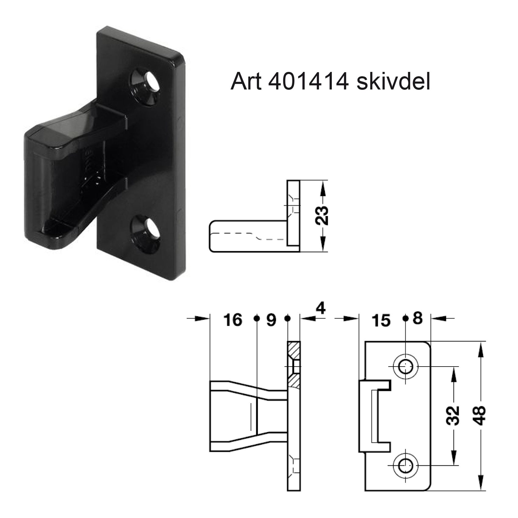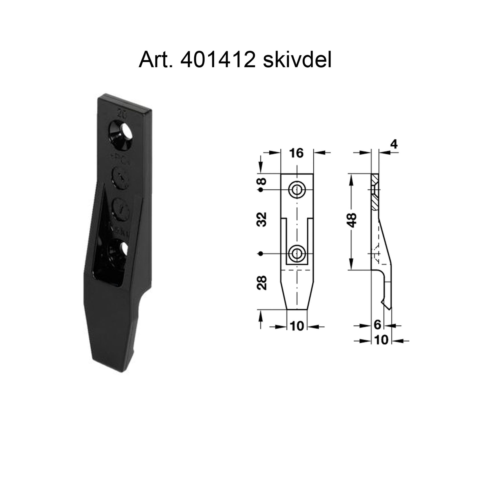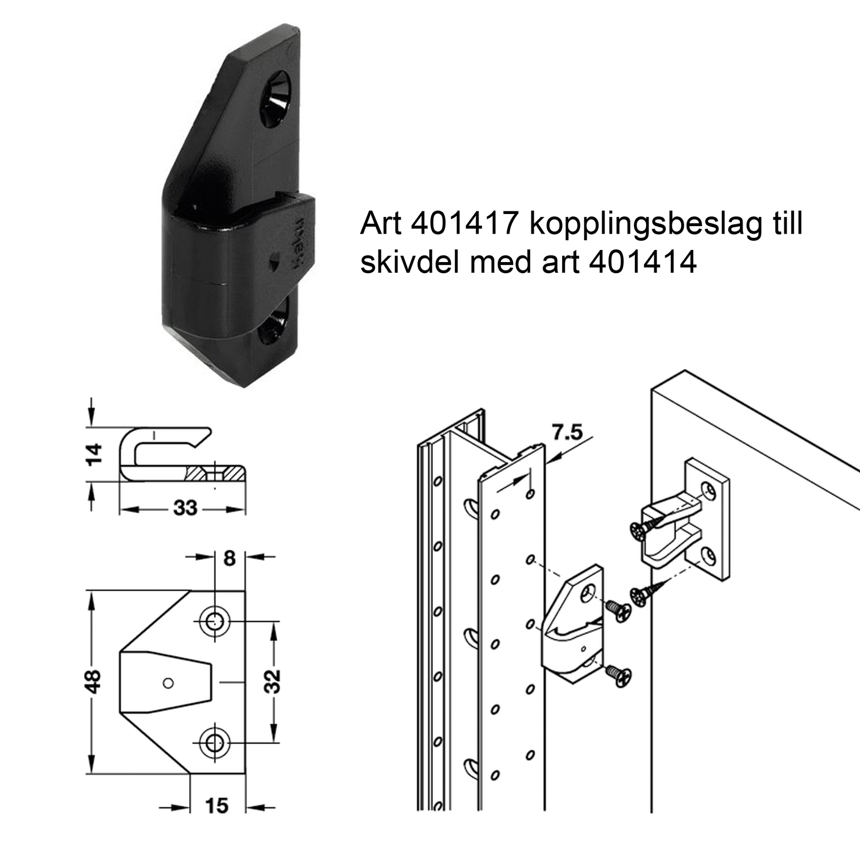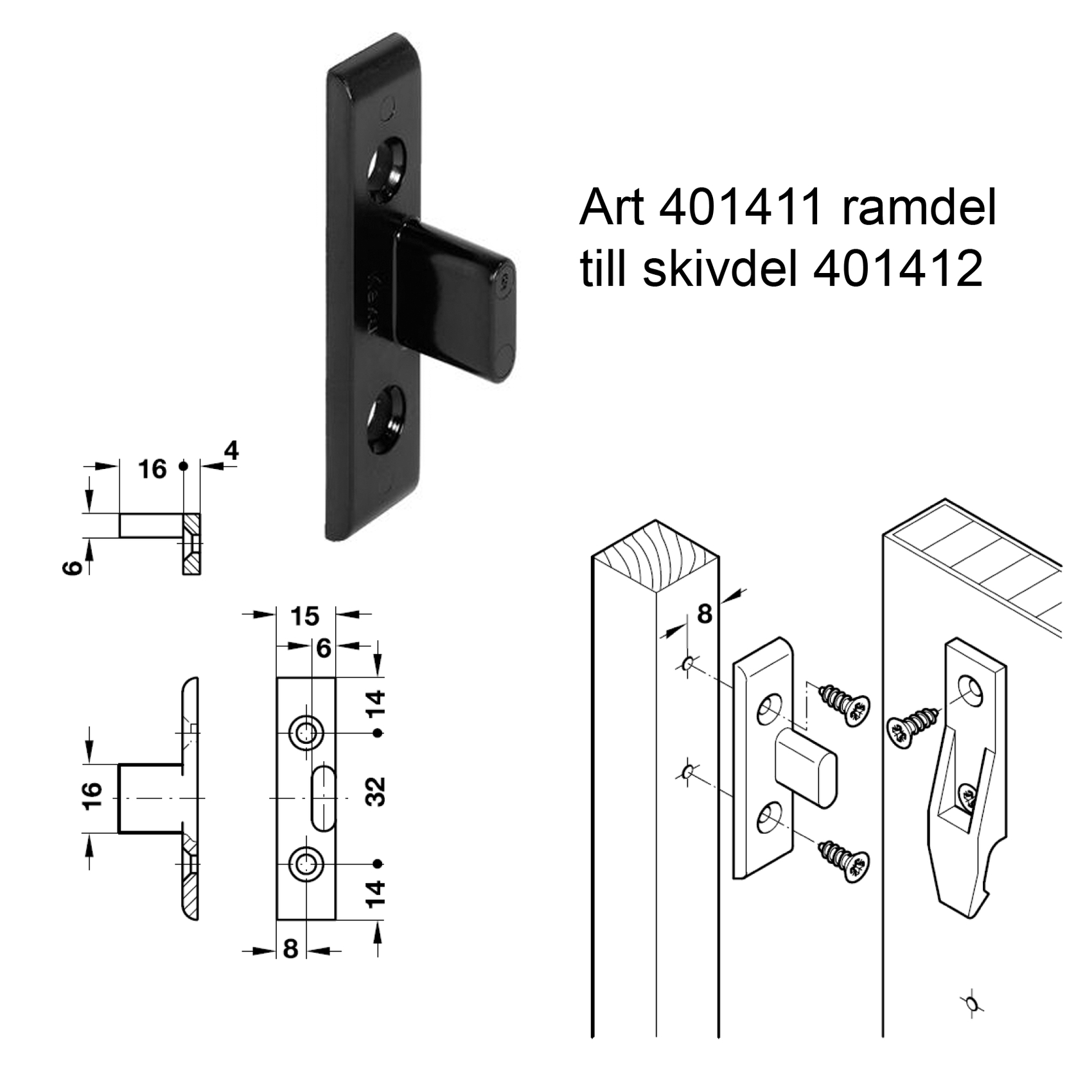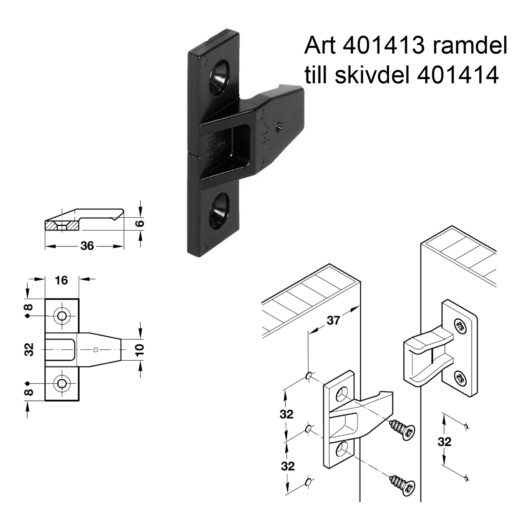 Ramdel med art 401411 används med skivdel 401412. Ramdel med art 401413 används med skivdel 401414. Även kopplingsbeslag med art 401417 används med skivdel 401414. Se teknisk information för ritningar. Passande skruv med försänkt huvud Ø 4,0 mm.