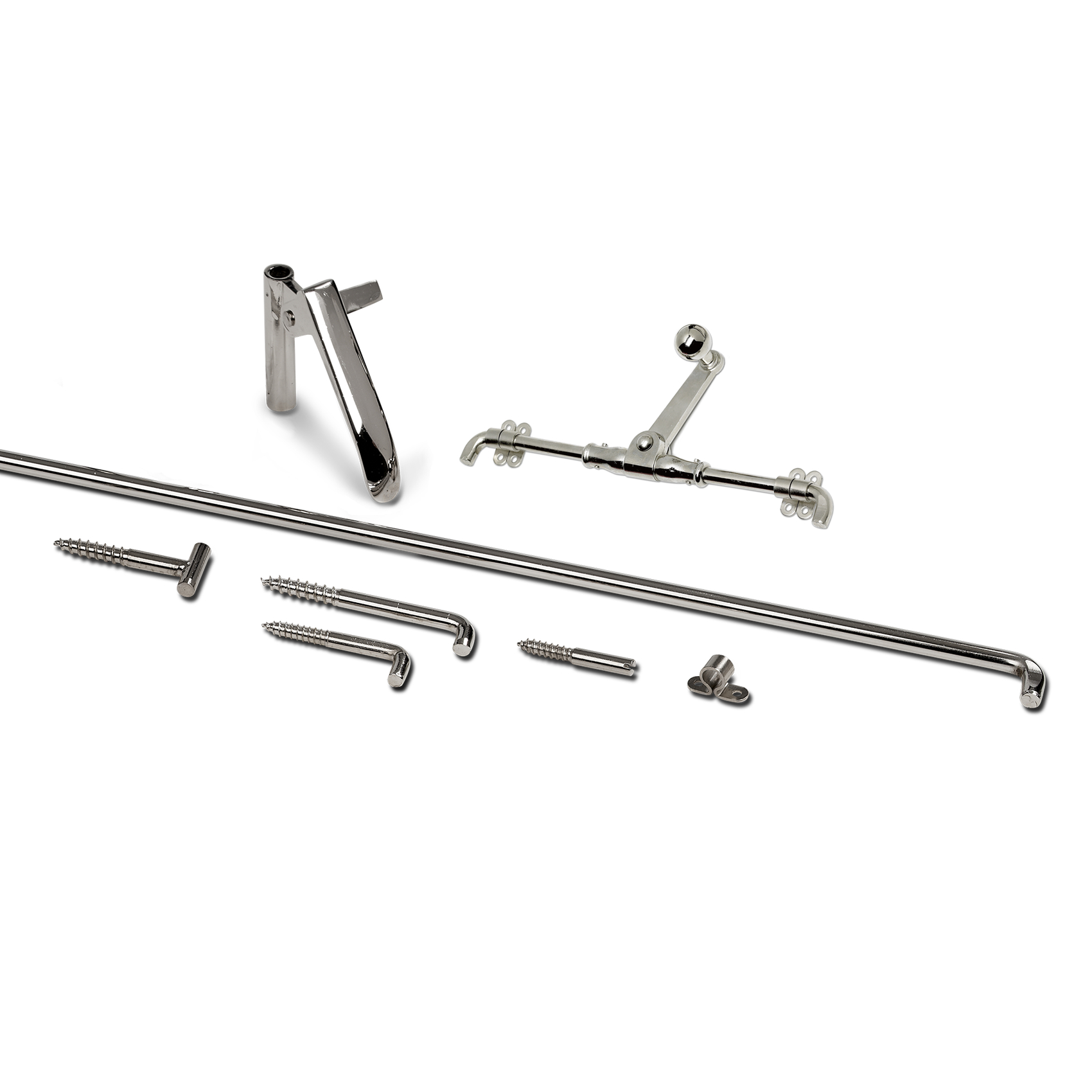 Espagnolette med stänger i förnicklad järn (N). För in- och utåtgående dörr och fönster. Stången finns i tre längder 750 mm, 1000 mm och 1250 mm. Se teknisk information för mer information om hur du sätter ihop en komplett spanjolett. Passande skruv 3,5 mm.