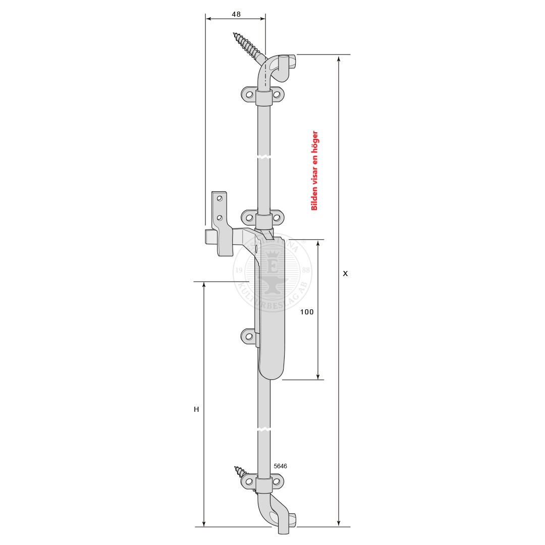 Levereras som standard hopsatt komplett med 65 mm karmkrokar och 12 mm hake. Vid placering på inre täcklist krävs djupare hake och längre karmkrokar. Alternativa hakar se art.nr 5694, 5695.